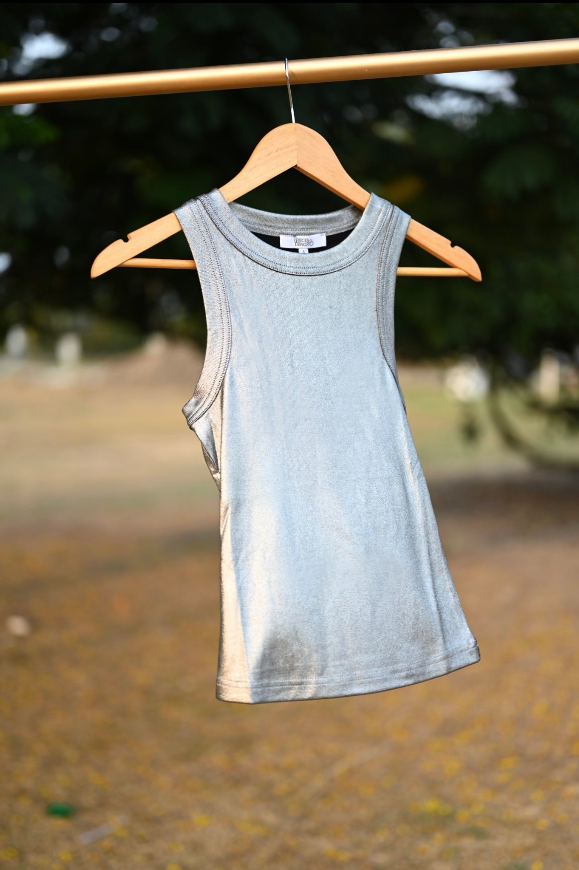 Introducing our Basic Silver Tank Top - the perfect addition to your wardrobe! This Metallic Coated Ribbed Knit Sleeveless Top offers a comfortable stretch and a luxurious metallic sheen, making it perfect for any occasion. With its ribbed texture and sleek, sleeveless design, it's a versatile piece that can be dressed up or down. Made with a blend of polyester and spandex, this top will keep you comfortable and stylish all day long.