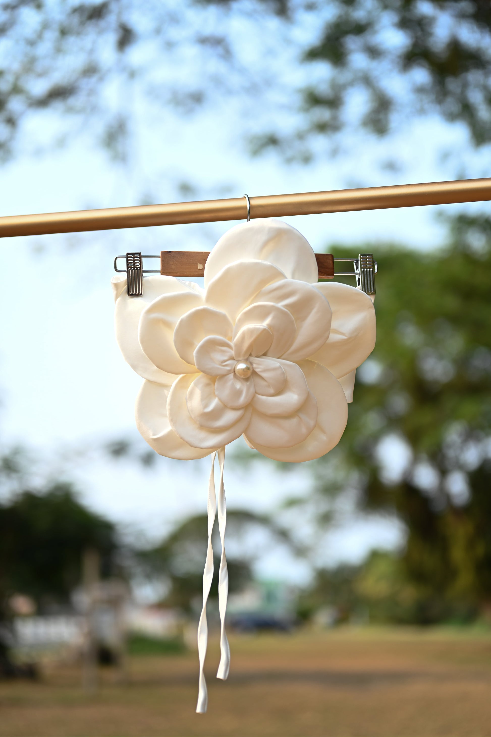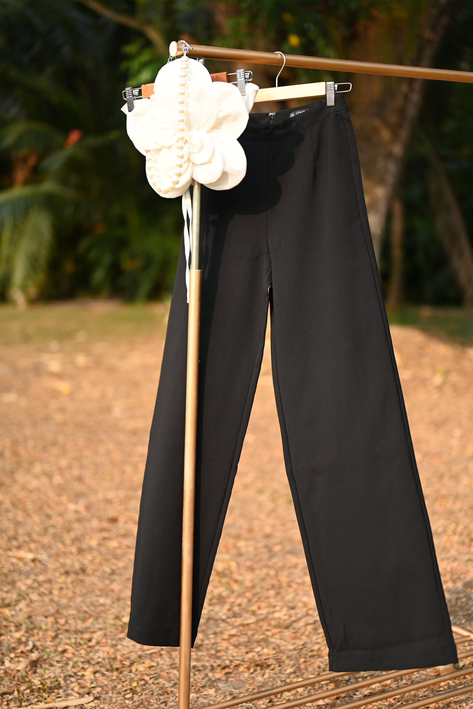 Gardenia 2-piece set features a stunning floral top with chunky pearl necklace detail, paired with sleek black high waist trousers.