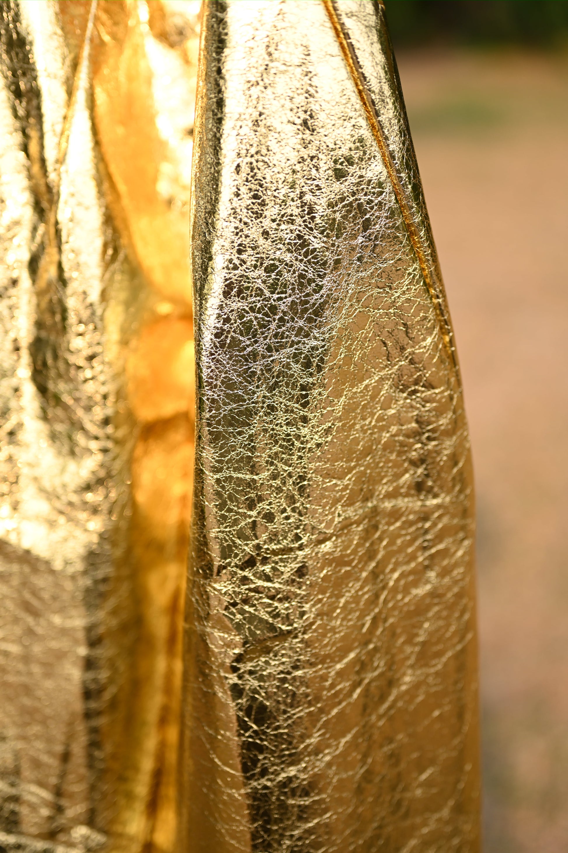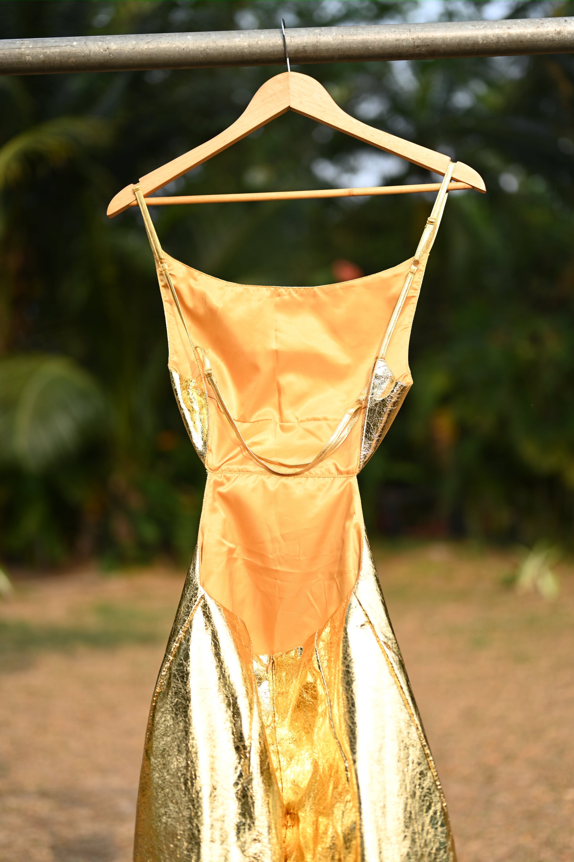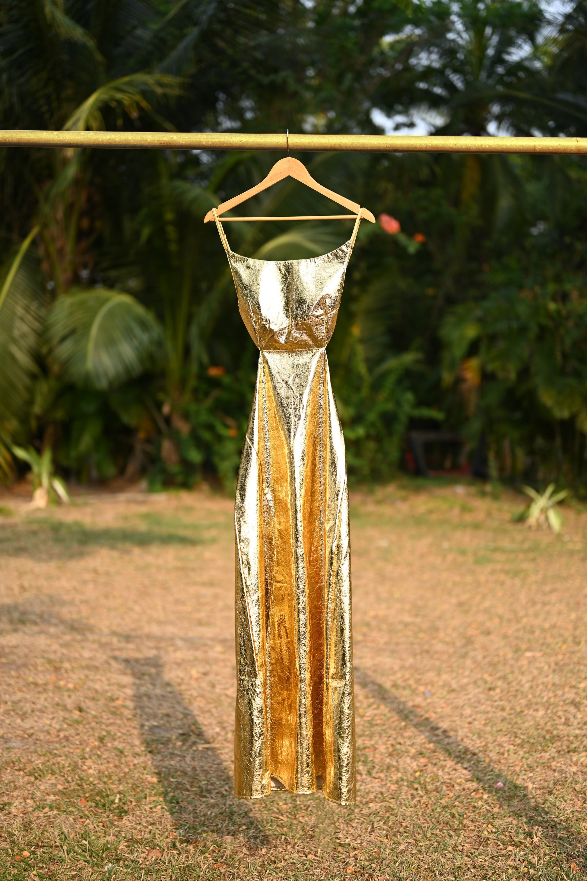 A stunning textured gold faux leather maxi dress. Fully lined with an open back detail, premium high shine fabric and architectural design. Guaranteed to get you noticed in any room you enter.