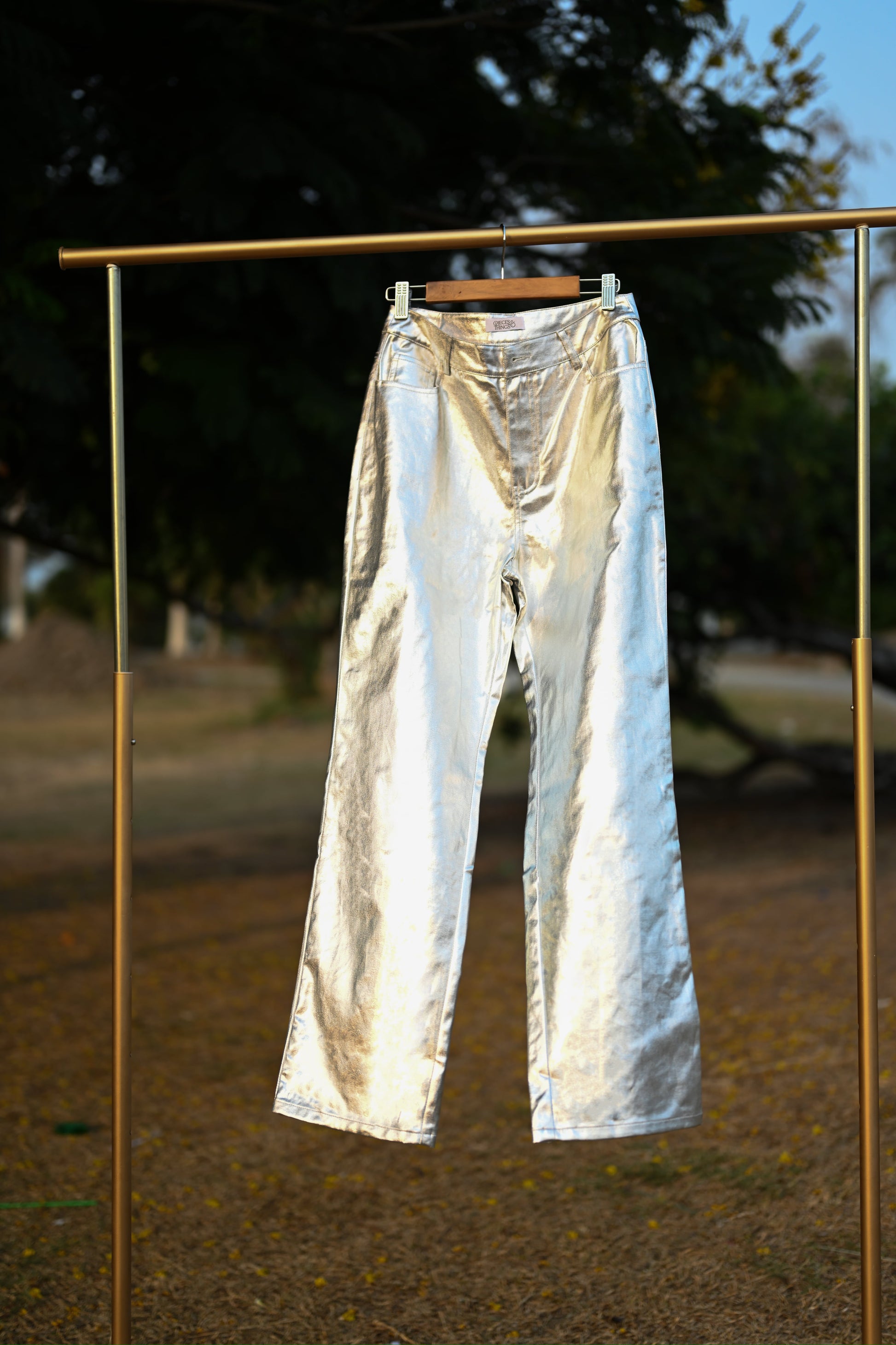 Metallic denim pants Non-stretch Metallic-coated denim 5-pocket design Straight leg fit.